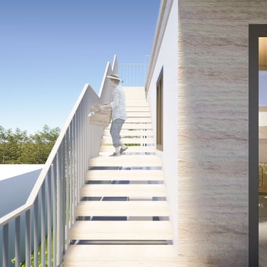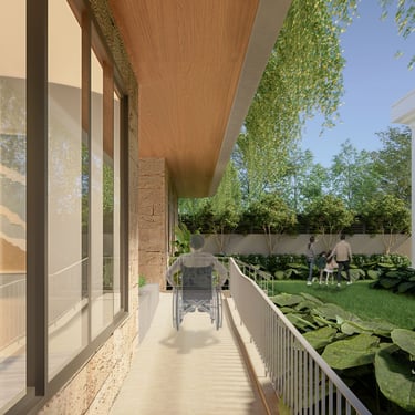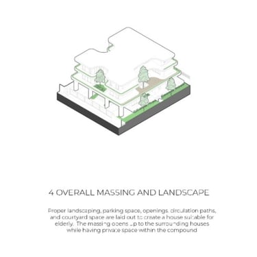 The Three House project for the elderly is designed according to the principles of Universal Design, aiming to enable elderly residents to live independently, safely, and comfortably. It features important functions that support comfortable, barrier-free circulation, such as the installation of ramps and the design of extra-wide walkways to accommodate the use of wheelchairs or walking aids. The design also considers maximum safety by ensuring floor surfaces are smooth and even, and installing grab bars in necessary areas to prevent accidents and tripping.