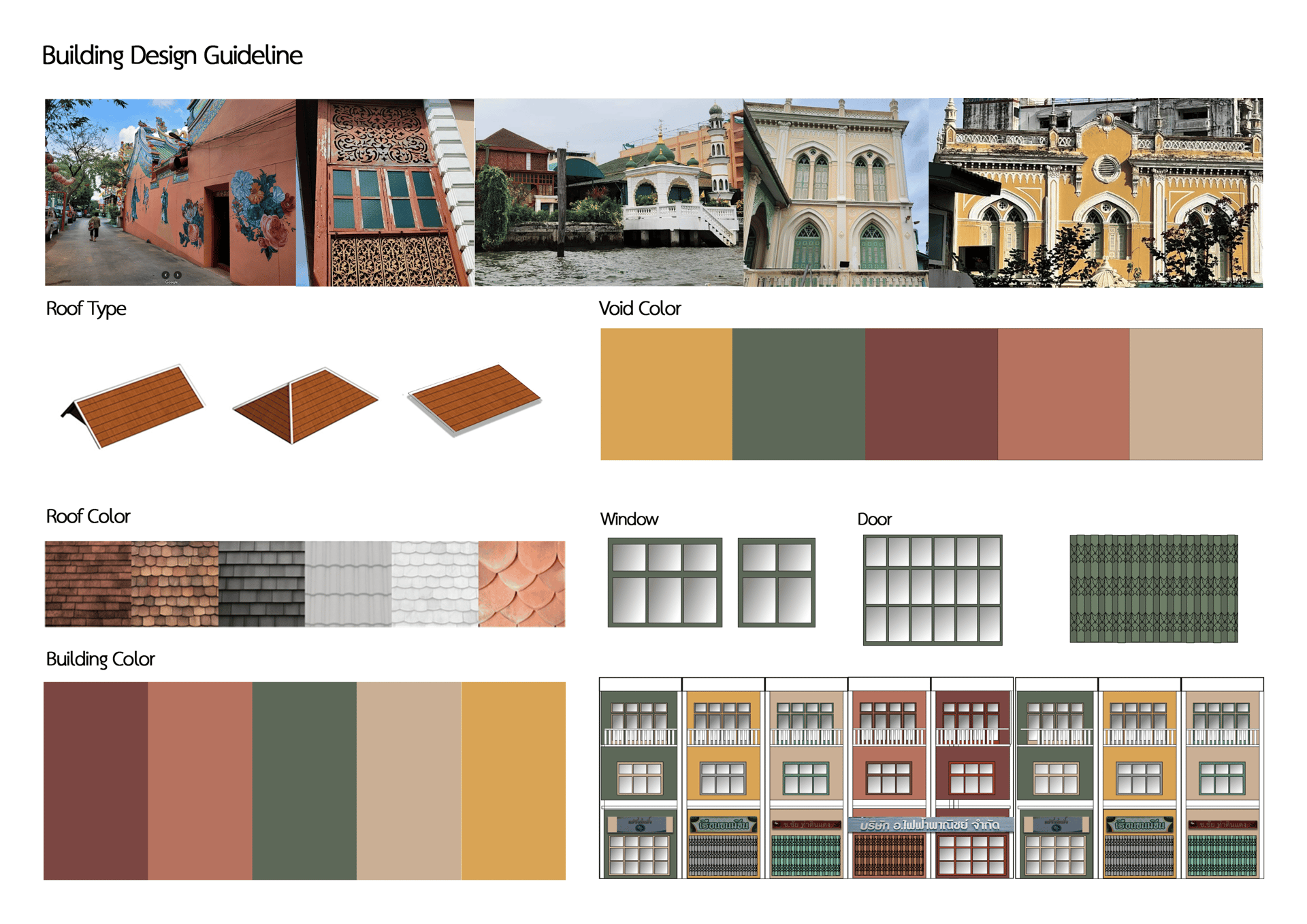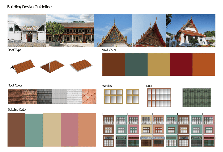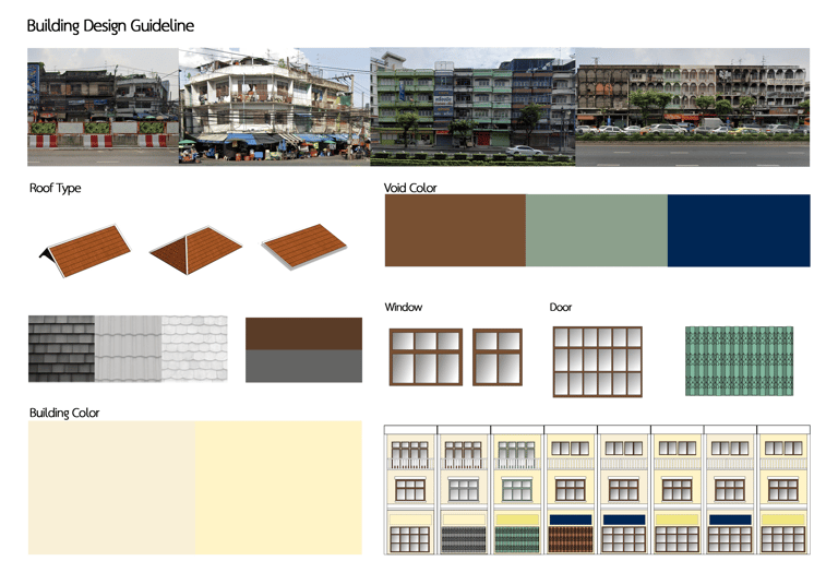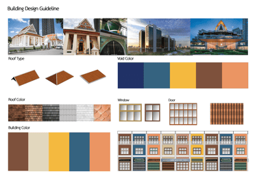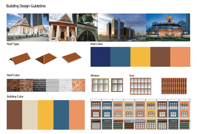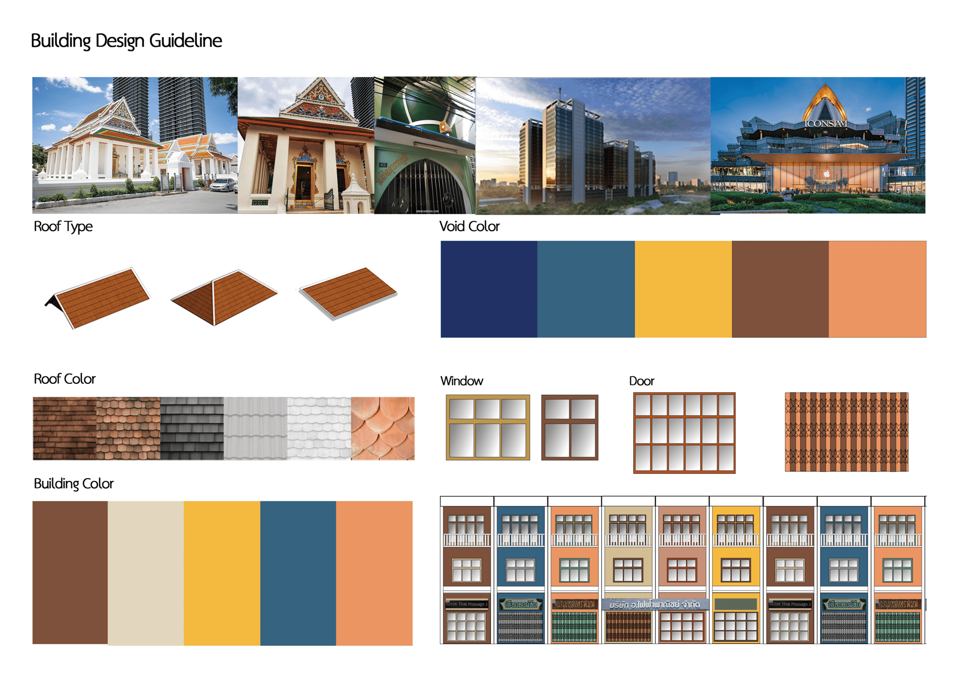 From a study of the architecture in the Mahathai - Charoen Nakhon area, it was found that the area has architectural elements that should be promoted to create a clear identity for the neighborhood. In the future, this area will become a government and waterfront commercial space with increased economic activity. Therefore, it is necessary to propose design and development guidelines for new buildings to have a unique character and create a memorable image for the neighborhood.