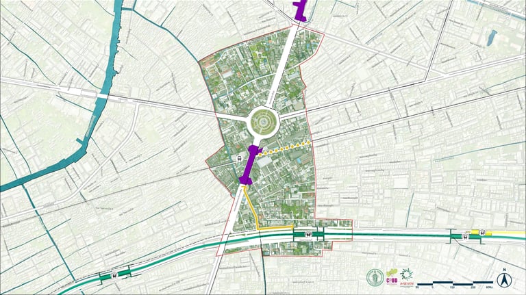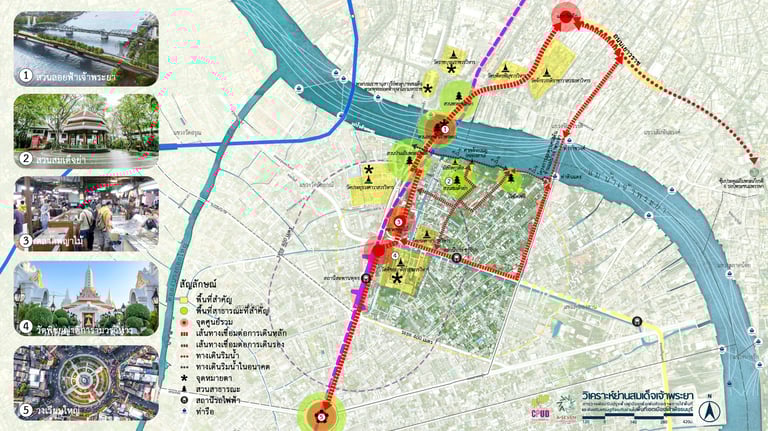 The Somdet Chaophraya area is a residential area located along the Chao Phraya River. It is a historic area with significant arts and culture, benefiting from the social and cultural capital inherent in the area, which can be leveraged for new creations. However, due to its location in a historic area, some parts of the area are restricted from development because of building height controls, which may affect future development. Regarding the internal transportation system, it lacks continuity and connection with other routes, especially with the main roads. Another significant problem in the area is the heavy traffic congestion during peak hours, particularly at the small clock tower roundabout. In the future, the arrival of the Purple Line (the MRT Chalong Ratchatham Line project) will make accessing the area easier, helping to reduce traffic congestion during peak hours. However, if these limitations can be addressed, the Somdet Chaophraya area will become even more livable due to the increase in public spaces and the complete integration of infrastructure to create a "Walkable City" that supports a high quality of life and accommodates the dynamics of changes in transportation and people's lifestyles in the future, which will help improve the quality of life and community economy.